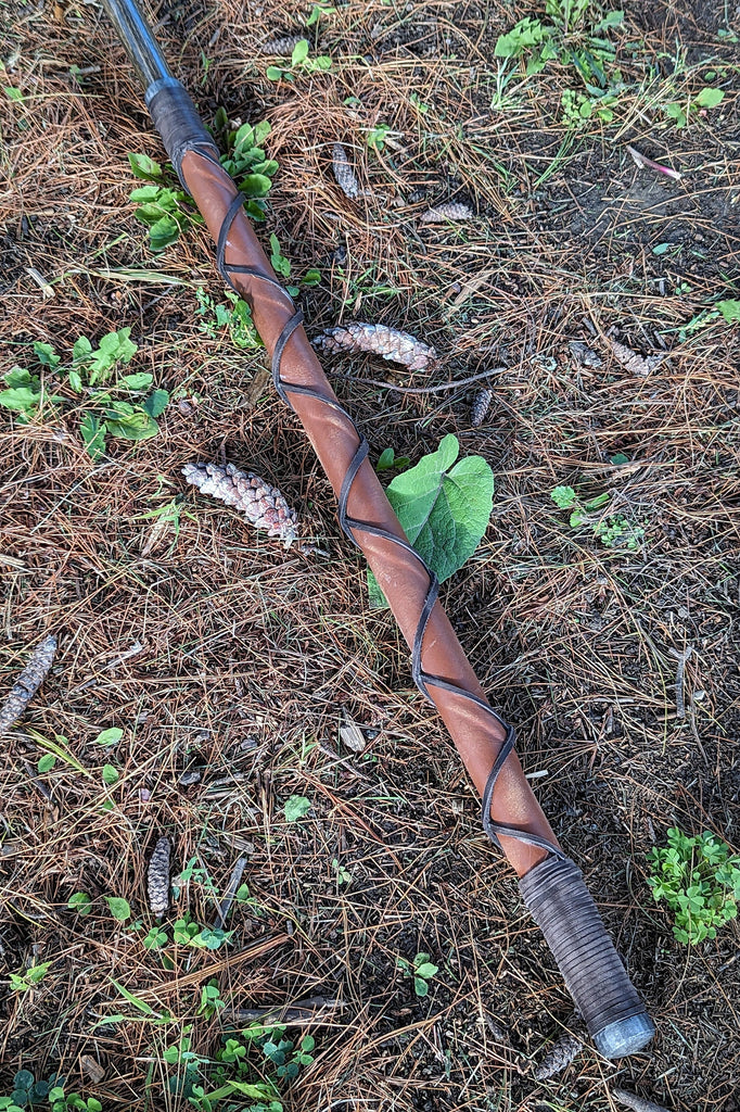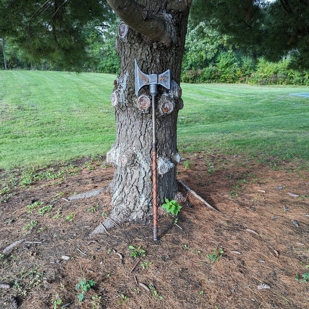 Medieval Fantasy Poleaxe Prop. Really stand out at at your next convention or faire with this handcrafted poleaxe featuring a cleaving axe head and a wide faced hammer, seated atop a stained wooden shaft with a hand bound real leather grip.